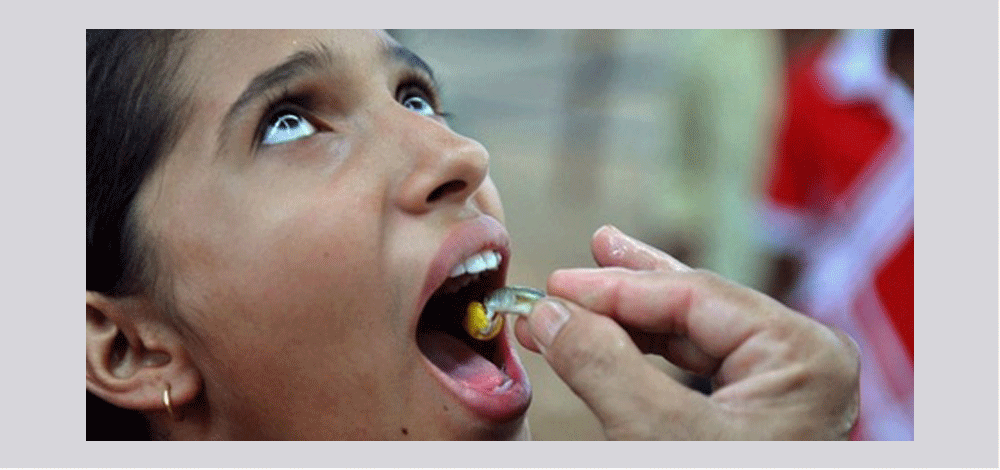 يتجمع آلاف الهنود ممن يعانون من مرض "الربو" ومشاكل في التنفس، لإبتلاع أسماك حية صغيرة الحجم، مغطاة بخلطة من الأعشاب كعلاج هندي لهذا المرض الخطر.