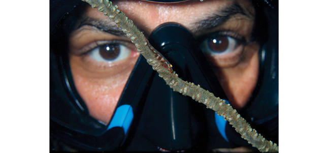 على الرغم من أن البشر يسببون أكبر تهديد لبيئتنا البحرية، فإن لديهم أيضاً القدرة على وضع خطط إدارة فعالة، من شأنها أن تكون المفتاح للحماية الناجحة للأحياء البحرية. صورة لسمكة الجوبي الصغيرة، وهي على السوط المرجاني، وفي الخلفية غواص من منطقة كومودو، إندونيسيا.