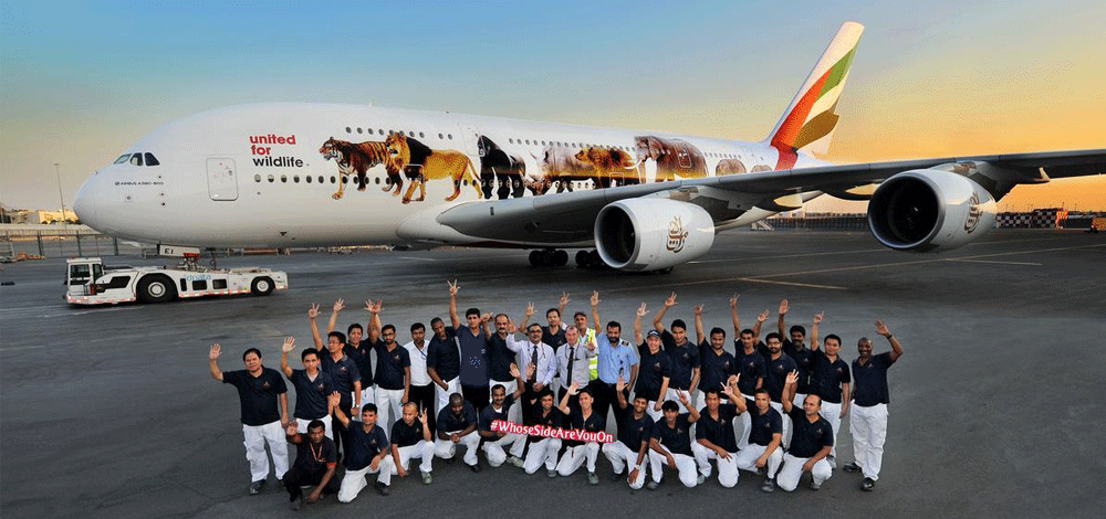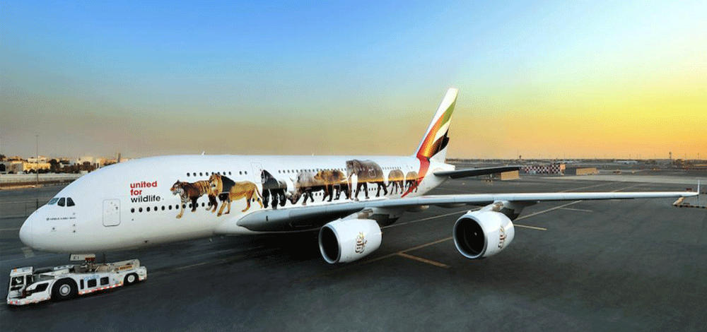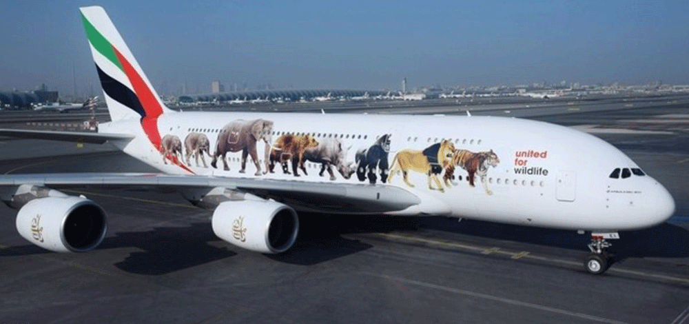 تنطلق اثنتان من طائرات طيران الإمارات العملاقة الإيرباص A 380، وعليهما من الخارج ملصقات ضخمة خاصة لدعم منظمة "متحدون من أجل الحياة البرية"، التي تنسق الجهود العالمية للمنظمات الدولية العاملة في محاربة الاتجار غير المشروع في الحياة البرية.