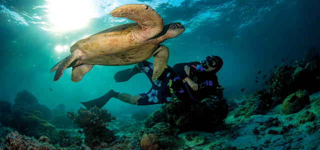 باكتشاف العلماء مدى تأثير الاتزان البيئى البحري في مصادر الغذاء، فرضت معظم حكومات العالم قوانين واتفاقات دولية صارمة في تقنين استخدام هذه المصادر البحرية بقدر ومواسم، ومحاربة الصيد الجائر والاستنزاف العشوائي لهذه الثروات، بما يخلق اتزاناً بيئياً غذائياً موفراً لهذه المصادر، كما ذهب العلماء إلى دراسة سلوك الأحياء البحرية، وفهم السلاسل الغذائية التى تنتمي إليها، لتجنب الإخلال بنظام غذاء الكثير من الأحياء البحرية. صورة التقطتها أثناء غطسة مع أحد دارسي علم الأحياء البحرية، في محاولة لمتابعة إحدى السلاحف البحرية الخضراء من منطقة سيبدان في ماليزيا.