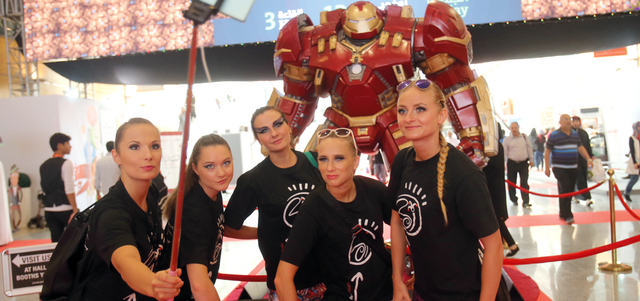 يحرص زوار على التقاط صور «السيلفي» مع «الرجل الحديدي» وغيره من الشخصيات. تصوير: مصطفى قاسمي