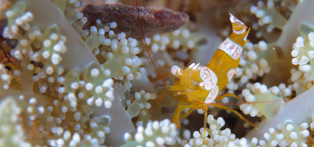 من أكبر التحديات التقنية التى يواجهها المصور الفوتوغرافي تحت الماء الإضاءة، والسبب هنا أن الماء يعمل على عزل الضوء 800 مرة أكثر من الهواء، وتتأثر ألوان الصورة بعد الأمتار الأولى من الغطسة، كما أن الألوان تتأثر بنسب معينة وأعماق مختلفة لقلة ضوء الشمس، وأول لون يتأثر هو اللون الأحمر، إذ غالباً نحتاج إلى الإضاءة بعد الأمتار الثلاثة الأولى من الغطسة في التصوير الفوتوغرافي تحت الماء. الصورة للروبيان الصغير من منطقة لمبي.
