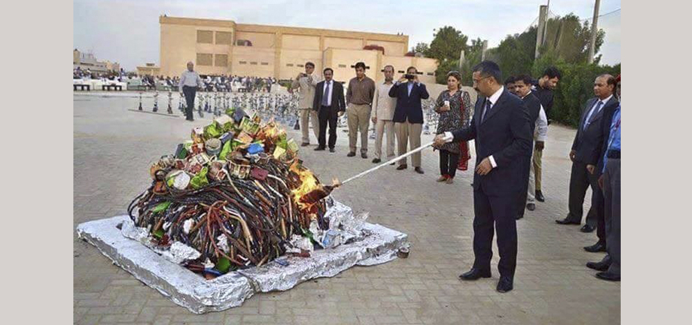 أحرقت هيئة الدفاع السكني في باكستان 8 آلاف "نرجيلة" في إحدى الساحات العامة في عملية تحمل إسم "إعدام 8000 نرجيلة في باكستان".