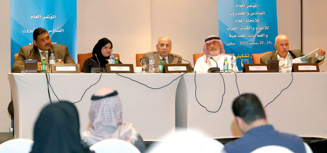 جانب من الأمسية الختامية لندوة «أزمة المفاهيم حول الحريات وحقوق الإنسان» التي عقدت على هامش المؤتمر العام الـ26 للاتحاد العام للأدباء والكتاب العرب. تصوير: إريك أرازاس