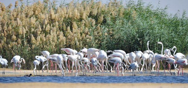 طيور فلامنغو تمرح بين طبيعة وظلال بحيرات القدرة، بالقرب من محمية المرموم والليسيلي في منطقة سيح السلم بدبي.