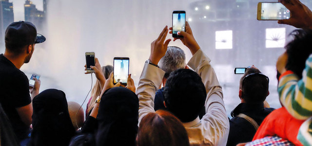 عدسات هواتف بالجملة، تلتقط صورة، أو تسجل لحظات للذكرى.. عن دبي الجميلة، ونافورتها التي تتمايل على نغمات شرقية وغربية، موزعة الفرحة على الجميع.
