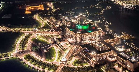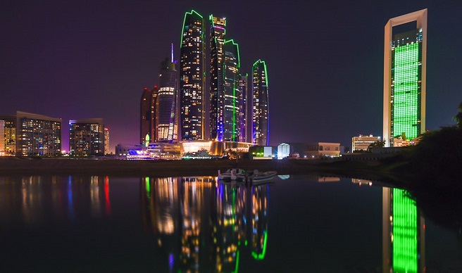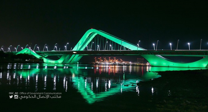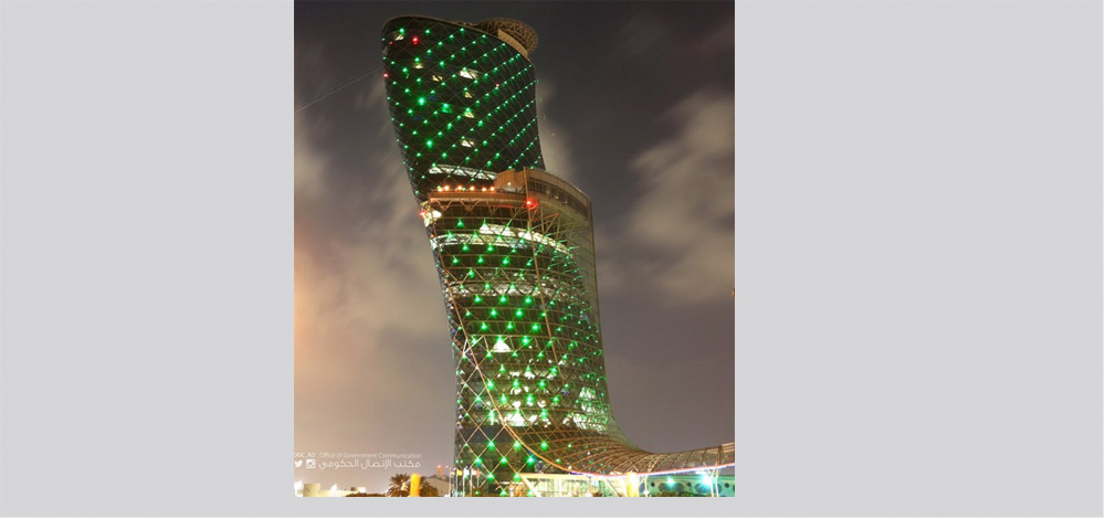 ونشر الحساب الرسمي لمكتب الاتصال الحكومي - حكومة أبوظبي عدداً من الصور للمباني منها صور جوية لفندق الإمارات ومقر أدنوك وأبراج الإمارات وبرج كابيتال جيت وجسر الشيخ زايد باللون الأخضر.