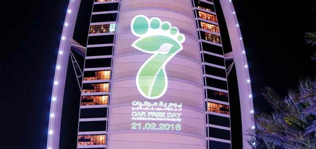 شعار «يوم بلا مركبات» على برج العرب، للتعريف بالدورة السابعة من المبادرة التي أطلقتها بلدية دبي، بهدف زيادة المشاركين والمتفاعلين مع الحدث.