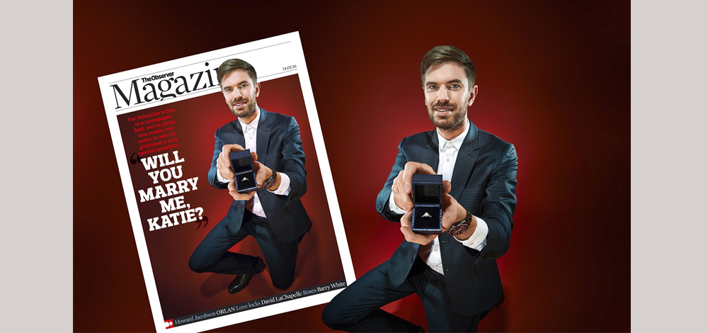تقدم شاب بطلب يد حبيبته في عيد الحب بطريقة مبتكرة، حيث ظهر "جيمس غريغ" على غلاف مجلة "ابزورفير" حاملا خاتم الزواج، مع عبارة كتبت إلى جانب الصورة "هل تقبلين الزواج بي يا كيتي"؟.