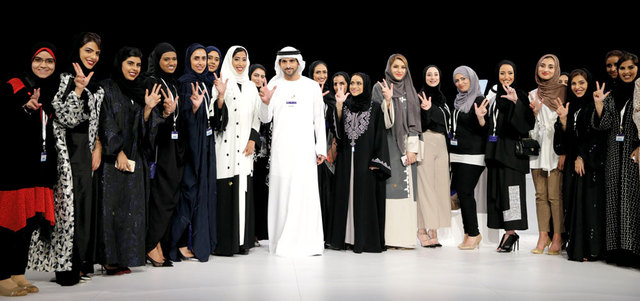 حمدان بن محمد بن راشد آل مكتوم مع فريق عمل «منتدى المرأة العالمي في دبي» في ختام الجلسة الافتتاحية للمنتدى. وام