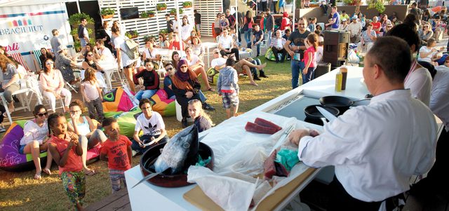 وقال أليساندرو: «لقد قمت باستخدام خبز الخروب لهذا الطبق الغني بالفيتامينات والمواد المضادة للأكسدة». واستعرض الشيف كيشي أوكابي من مطعم «أوكو» في دبي على المسرح الرئيس لكانتين الشاطئ برعاية اتصالات، سمكة التونة المستوردة من اليابان، والتي تزن سبعة كيلوغرامات، وقطعها إلى شرائح وغطاها بالسمسم الأبيض والأسود بشكل كامل، وقام بقلي هذه الشرائح. وبعد أن انتهى أضاف الصلصة إلى الشرائح المقدمة في الأطباق.
