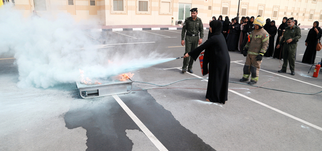 طالبات في الجامعة القاسمية بالشارقة يتدربنَ على إطفاء الحرائق، خلال دورة تزامنت مع اليوم العالمي للدفاع المدني، وأعربت الطالبات عن سعادتهن بما اكتسبنه من خبرات نظرية وعملية في هذا الجانب، لأجل الحفاظ على الأرواح والممتلكات.