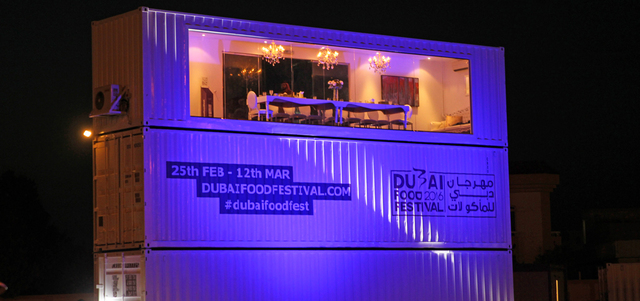 تمنح "مأدبة طهاة دبي"، التي تم إعدادها خصيصا خلال فعاليات مهرجان دبي للمأكولات، وهي مكوّنة من غرفة ذات واجهة زجاجية مكيفة مضاءة على ارتفاع 40 قدماً، مبنية على حاويات شحن نمطية ومطلة على شارع الشيخ زايد الضيوف تجربة فريدة من نوعها.