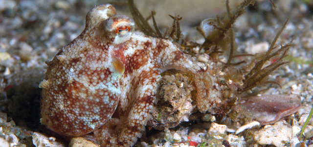 الأخطبوط قادر على تغيير لونه بسرعة بأن يقلص أو يوسع مناطق الصبغيات في خلايا تدعى الخلايا الملونة، ما يساعد على تمويهه مهما بلغت الخلفية. كما يستعمل الألوان للتعبير عن مزاجه، فهو يتحول إلى الأحمر عند انزعاجه، ويصبح شاحباً إذا شعر بالتوتر.. صورة لأخطبوط جوز الهند وهو في حالة تمويه / من منطقة لمبي في إندونيسيا.