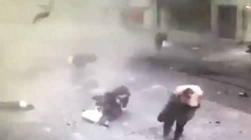 وما هي إلا لحظات، حتى وقع انفجار ضخم في وسط الشارع، الذي تصطف المحال التجارية على جانبيه، وشوهد المارّة وهم يتراكضون يميناً وشمالاً، فيما سقط بعضهم مصاباً على الأرض.