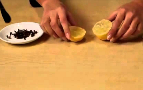 5- تقطيع حبة من الليمون الحامض، وتثبيت حبات القرنفل على أجزائها ووضعها في طبق على طاولة المطبخ.