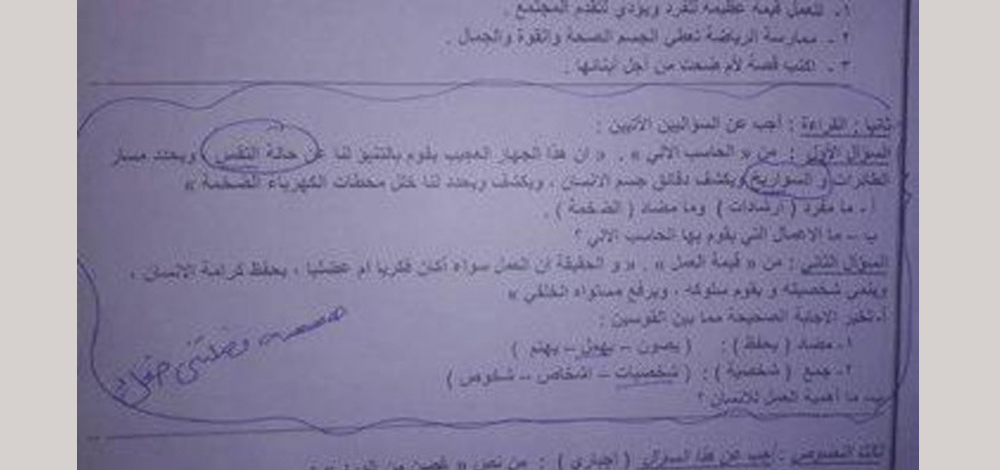 وتضمنت ورقة الامتحان التي عرضت على الطلاب كلمتي: "التقس" و"السواريخ"، بدلا من الطقس والصواريخ، وكلمة "سحيح" بدلاً من صحيح.