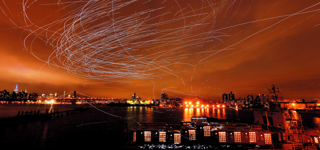 وما إن حل المساء على ساحة البحرية في بروكلين - التي كانت يوماً موقعاً لأكبر «أسطول» من الحمام الزاجل الذي تستخدمه البحرية آنذاك - فتح الفنان ديوك رايلي باب حظيرة ضخمة للحمام لبدء العرض الذي أطلق عليه اسم «الطيران ليلاً».