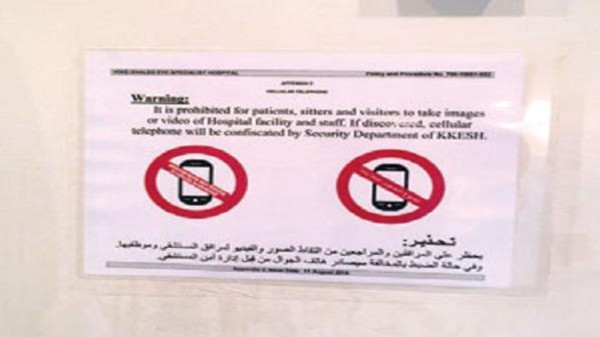 ووضعت لافتات تم تركيبها في بعض المستشفيات ومن ضمنها مستشفى الملك خالد التخصصي للعيون في الرياض، الذي حذر بصفة قطعية المرضى والمراجعين من التقاط الصور والفيديوهات لمرافق المستشفى أو العاملين فيه.