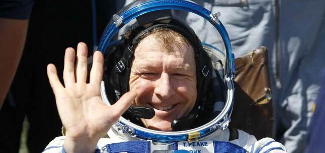 رائد الفضاء تيم بيك سعيد بعودته إلى الأرض. أ.ب