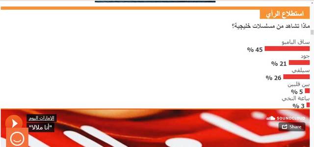 في استطلاع أجرته «الإمارات اليوم» حول سؤال ماذا تشاهد من مسلسلات خليجية؟ تصدر مسلسل «ساق البامبو» النسبة الأعلى للمتابعة، حيث حصل على نسبة 45%، في المقابل حصل مسلسل «بياعة النخي» على أدنى نسبة مشاهدة وصلت إلى 3%، في حين حصل مسلسل «سيلفي» على نسبة 26%، وحصل مسلسل «جود» على نسبة 21%، ومسلسل «بين قلبين» على نسبة 5%.