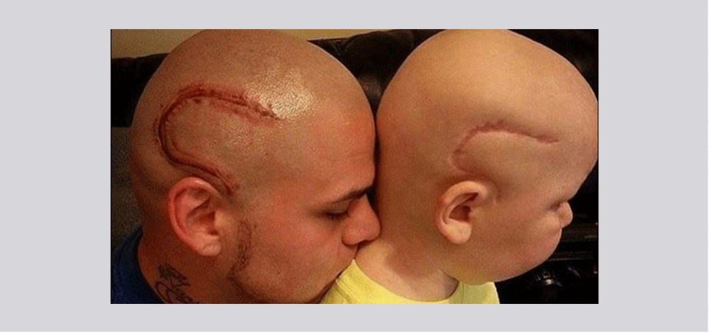 وحصل الوالد على وشم في الرأس يشبه الندبة التي تركتها آثار العملية على رأس طفله.