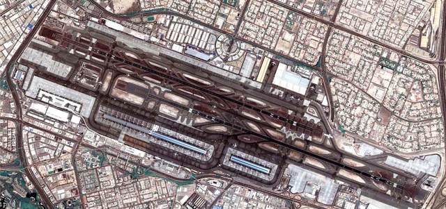 لقطة لمطار دبي الدولي من الجو، بعد انضمام مبنى «كونكورس دي» إلى مباني المطار، ما رفع طاقته الاستيعابية إلى 90 مليون مسافر سنوياً.