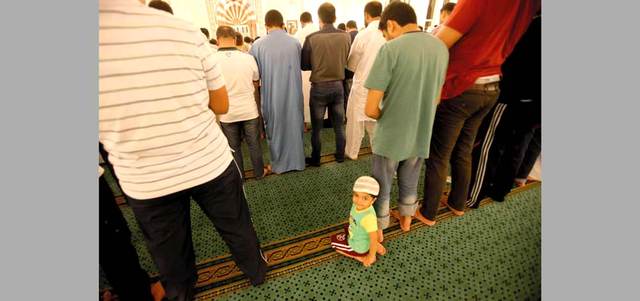 طفل مع والده في أحد مساجد الشارقة أثناء تأدية صلاة التراويح. تصوير: مصطفى قاسمي