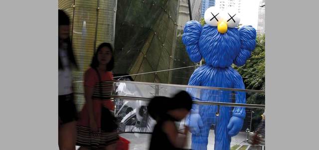 أناس يسيرون بالقرب من تمثال «كواس: بي إف إف» المنصوب أمام مركز تسوّق «سنترال إمباسي» في العاصمة التايلاندية بانكوك. إي.بي.إيه