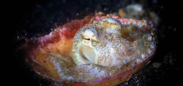 الأخطبوط كائن فى غاية الذكاء، وهو الأذكى بين اللافقاريات على الإطلاق، حيث أثبتت التجارب والدراسات أن الأخطبوط لديه نظام ذاكرة قصير مؤقت، ونظام ذاكرة طويل المدى، وغير معروف حتى الآن كيف يتعلم صغار الأخطبوط السلوكيات، بسبب عدم وجود اتصال بينها وبين والديها، ويستخدم الأخطبوط ذكاءه فى التخفي من الحيوانات المفترسة، فهو يستخدم التمويه وأكياس الحبر في مواجهة الحيوانات المفترسة ليتمكن من الهرب منها، حيث يخرج الأخطبوط كمية كبيرة من الحبر الأسود مكونة سحابة سوداء تساعده فى الهرب، ويتكون هذا الحبر الأسود من مادة الميلانين، التي يستخدمها البشر فى صبغات الشعر، كما أن تلك المادة تؤثر في حاسة الشم لدى أسماك القرش المفترسة، كما أن تكوين جسم الأخطبوط الخالي من العظم يجعله قادراً على الانضغاط والاختباء داخل الأماكن الضيقة المظلمة. صورة لأخطبوط جوز الهند بمنطقة لمبي في إندونيسيا.