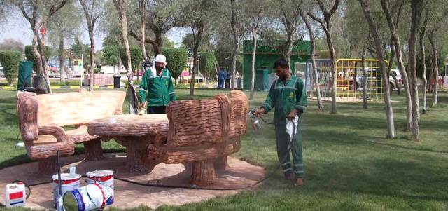 العمال ينهمكون في صيانة المقاعد ومواقد الشواء وطلائها بألوان زاهية تعزز جاذبية المكان. من المصدر