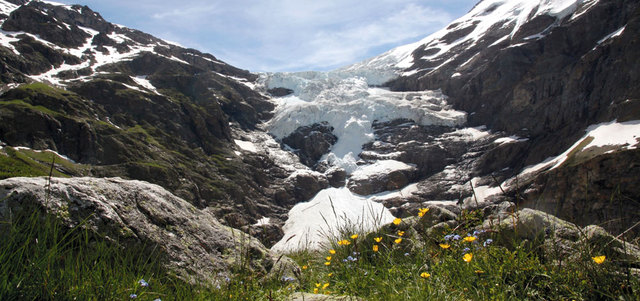 وتتساقط كتل الجليد من الجبل بمعدل كل نصف ساعة تقريباً، ويصدر عنها هدير مثير للإعجاب، وتتلألأ صخرة سوداء تحت أشعة الشمس وتقسم النهر الجليدي إلى قسمين، وبالتالي تزداد المساحة، التي تتعرض للأشعة الدافئة.