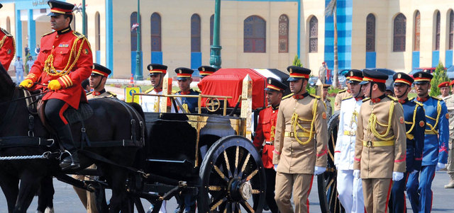 وتقدم الرئيس المصري، وكبار رجال الدولة، ونجلا الفقيد، الجنازة العسكرية، التي أقيمت بساحة مسجد المشير طنطاوي، في حي التجمع الخامس شرق القاهرة. وسار المشيعون نحو 100 متر، فيما عزفت فرق موسيقية عسكرية موسيقى جنائزية. ولف النعش بعلم مصر، ووضع على عربة تجرها ستة خيول، يعتليها رجال يرتدون ملابس رسمية حمراء، ويحيط بها رجال يرتدون الملابس العسكرية لمختلف الأسلحة المصرية.