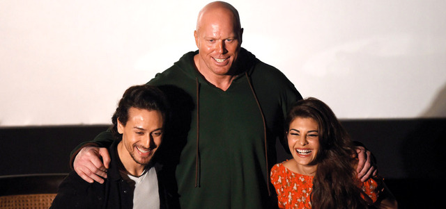 نجم سينما بوليوود الهندية تايغر شروف (يسار)، والنجم الأسترالي والمصارع المحترف، ناثان جونز (في الوسط)، ونجمة بوليوود السريلانكية، جاكولين فيرنانديز (يمين)، يقفون أمام الكاميرا خلال حفل ترويجي للفيلم الهندي المقبل «جات الطائر» في نيودلهي.