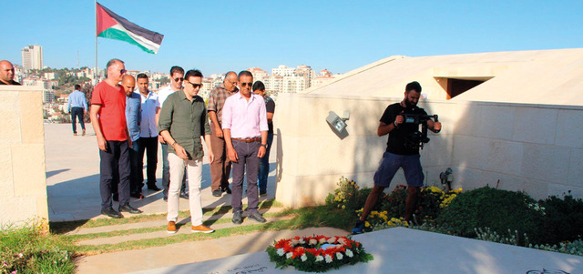 صابر الرباعي خلال زيارة متحف محمود درويش حيث وضع إكليلا من الزهور على ضريحه. أرشيفية