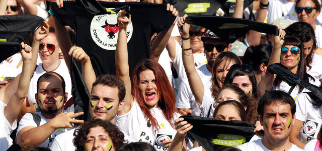 احتشد بضعة آلاف في العاصمة الإسبانية مدريد، أول من أمس، للمطالبة بحظر مصارعة الثيران، ليضموا أصواتهم إلى حركة متنامية للدفاع عن حقوق الحيوان، دفعت بعض السلطات المحلية إلى تضييق الخناق على ذلك التقليد الذي يرجع إلى قرون. ولاتزال مصارعة الثيران شائعة في إسبانيا، ولها جمهور من المتابعين الشغوفين. وينجذب الكثير من السياح أيضاً لبعض المهرجانات السنوية ــ مثل مهرجان سان فيرمين ــ التي تركض خلالها الثيران في شوارع مزدحمة في مدينة بامبلونا الشمالية، لكن حملة ضد مصارعة الثيران وغيرها من الرياضات الدموية تكتسب أيضاً قوة دافعة، وهناك تناقص سنوي في أعداد مهرجانات مصارعة الثيران، لأسباب من بينها الأزمة الاقتصادية.