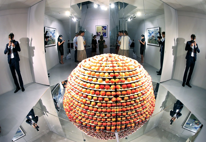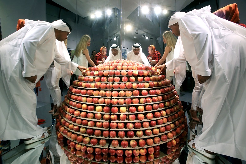 ما الذي يمكن أن تدمره الأفعال البسيطة في الحياة كقضم التفاح مثلا؟ هو تساؤل يطرحه الفنان الباكستاني أشكت أخميدياروف من خلال العمل التركيبي الذي صممه من طبقات مرصوفة من التفاح، وتأخذ شكل ربع دائرة، بينما تحيل المرايا المحيطة بالعمل من الجوانب والاسفل هذه الربع دائرة الى شكل دائرة كاملة بفعل انعكاس الصورة.
