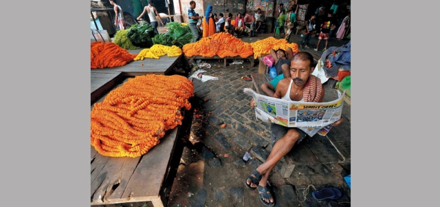 رجل يقرأ صحيفة بجانب أكاليل القطيفة، التي تستخدم لتزيين المعابد والمنازل خلال مهرجان هندوسي من دورجا بوجا، في سوق في كلكتا، بالهند.