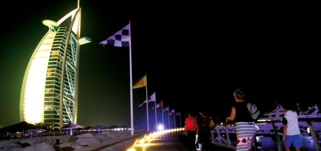 سياح يستمتعون بليل دبي وطقسها الرائع والمعالم الجميلة المتفردة.