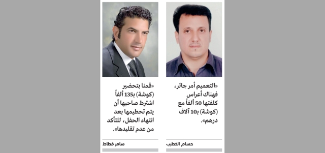 سامر قطاط، الذي يعمل منذ 18 سنة في سوق تنظيم الأعراس الإماراتية، استعرض شيئاً من تجربته معها، وقال: «أظن أننا قادرون اليوم أن نستوعب العلاقة بين الكلفة الخيالية للأفراح الإماراتية، وعزوف كثير من الشبان عن الزواج، وذلك بسبب الطلبات المجحفة والالتزامات المالية المفروضة من قبل العروس وعائلتها، وعامة ما تعتمد هذه (المطالبات) إما على (الغيرة) من تجارب الأعراس الخيالية لبعض الصديقات والأقرباء، أو على التقليد غير الواعي لأعراس الغير، وهذا ليس مرتبطاً كما يعلم الكل فقط بتكاليف حفل الزواج، بل بالأرقام المتصلة بالمهر والسكن والفرش، وبعض التفاصيل التي تتخطى أحياناً حدود المقبول والمتوقع، وسقف المساعدات التي يقدمها الديوان الحكومي للمقبلين على الزواج، وذلك بسبب الأرقام غير المعقولة التي يقدمها هؤلاء الشباب للحصول على الدعم المالي، ونوفرها نحن عند الطلب»، ويتابع: «هذا إلى جانب (الكوشة) التي تختارها العروس وتجبر عليها العريس، التي قد تبدأ أحياناً من 150 ألفاً لتبلغ حدود الـ300 ألف درهم، أما كلفة بعض الأعراس فيمكن أن تراوح بين 900 ومليون درهم، وهذا ليس أمراً يومياً بقدر ما هو وارد جداً في الإمارات».