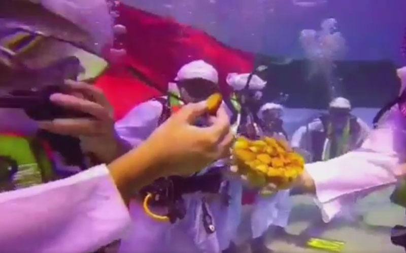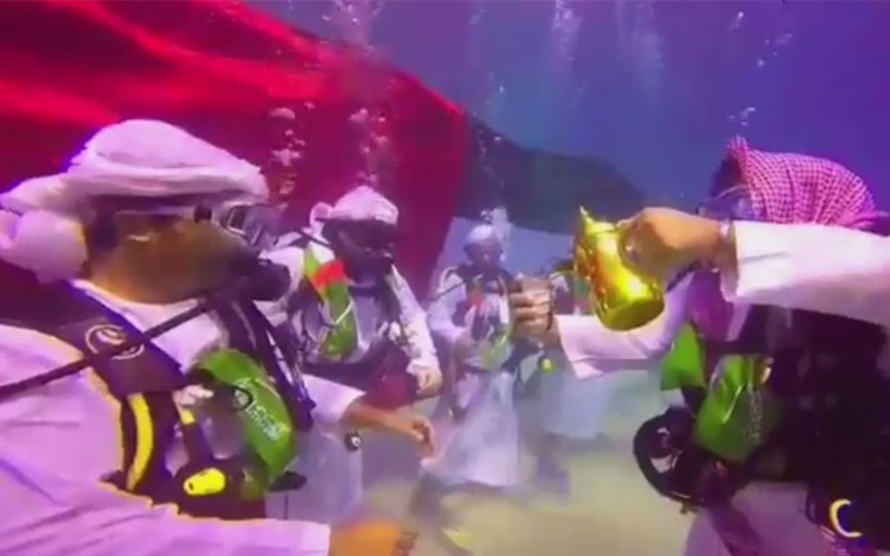وقام فريق الغواصين بممارسة العادات الإماراتية والتراثية بشرب القهوة العربية والتبخير ورقص اليوله تحت أعماق البحار.