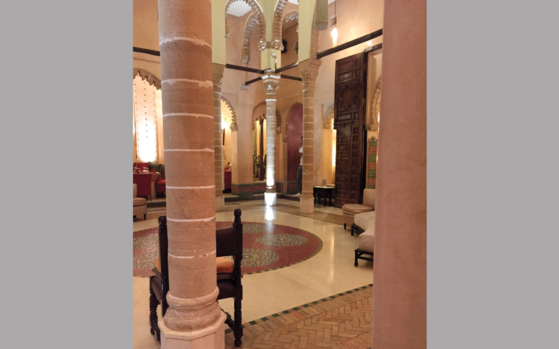 يلفت النظر تباين ألوان المدينة، بأسوارها من الطين الوردي، وجدرانها المغطاة بالنباتات، حيث تظهر باقات من النخيل والخضرة، مشهد رائع وسط قمم الأطلس الكبير المغطى بالثلوج، تحت سماء صافية زرقاء، توحي بالطبيعة الحقيقية لمراكش، واحة خصبة مشمسة، حيث تفوح رائحة الزهور، كالياسمين أو زهرة البرتقال التي تنبعث من الحدائق النضرة.