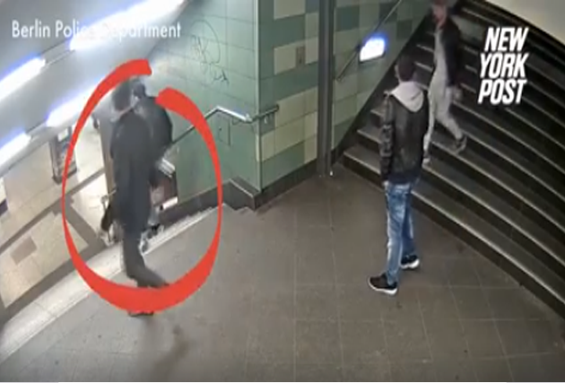 أظهرت كاميرات المراقبة في إحدى محطات النقل في برلين مجموعة من الشبان، وهم يتبعون فتاة على سلالم المبنى، حيث يقوم أحدهم بلكم الشابة من الخلف، لتسقط على وجهها بطريقة عنيفة، فيما يفر الشبان الى جهة مجهولة.