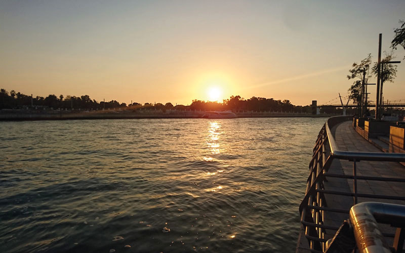 غروب آخر يوم في 2016 يلوّن قناة دبي المائية أحد منجزات الإمارة خلال العام الذي صار «ماضياً».