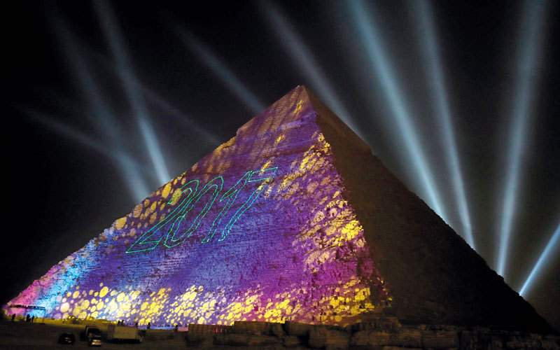 احتفلت مصر بالعام الجديد بعرض للألعاب النارية، وعد تنازلي عند سفح الأهرامات في الجيزة عند منتصف الليلة قبل الماضية.