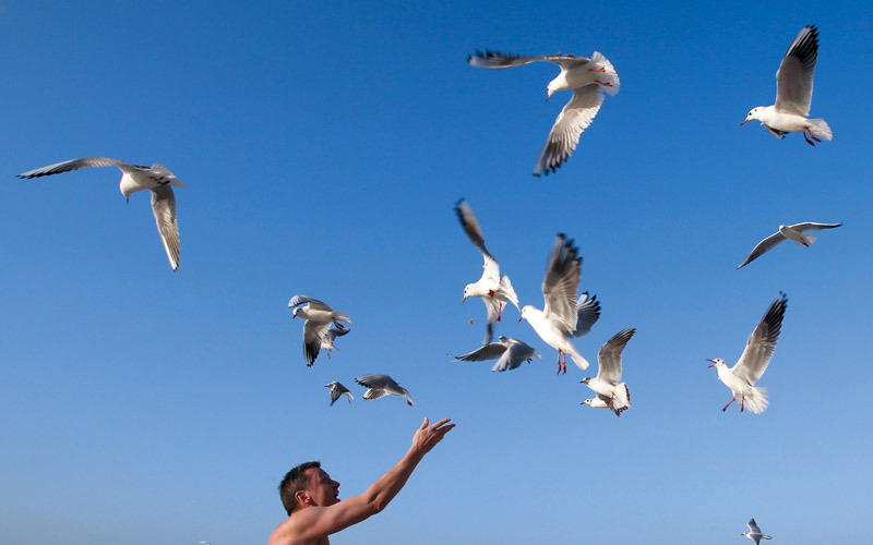 وكأنها تحية متبادلة.. بين نوارس البحر، ومن يحاول إطعامها على شاطئ «جميرا بيتش ريزدنس» في دبي.