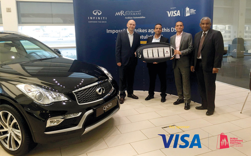 ضمن حملتها الترويجية «عروض تتجاوز المستحيل» في مهرجان دبي للتسوق، أعلنت شركة «فيزا»، شريك المدفوعات الرسمي للمهرجان، عن فوز اثنين من سعداء الحظ، حاملي بطاقات فيزا، بسيارتي «إنفينيتي كيو إكس 50» الكروس أوفر الفاخرة الرياضية متعددة الاستخدامات.