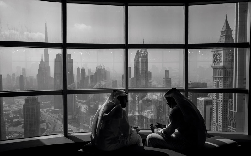 حديث ودي.. ومشهد بانورامي يطلّ من «أبراج الإمارات» على معالم مدينة تبدو زاهية «بالأبيض والأسود»، وكل الألوان.. دبي.