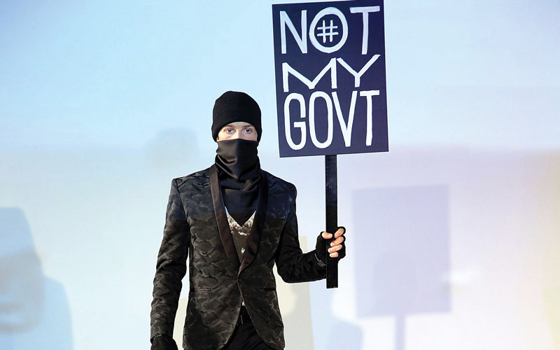 صيحات جَسدها اللون والملمس، ولوحات رفعها عارضون، انطلقت في اليوم الأول لأسبوع الموضة بنيويورك، الذي بدأ بعرض لأزياء الرجال، أول من أمس. ومزج روبرت جيمس بين الموضة والسياسة لعرض مجموعته الجديدة. وقال المصمم الذي يعيش في نيويورك إنه لانشغاله الشديد بإعداد مجموعته الجديدة، لم يستطع المشاركة في أيٍّ من الاحتجاجات الأخيرة، فقرر التعبير عن مخاوفه على ممر عرض الأزياء. وضمت المجموعة ثلاثة ألوان رئيسة، هي: الزيتوني، والرمادي الداكن، والأسود. وعاد بيت الأزياء العالمي ديفيد نامان، إلى أسبوع الموضة في نيويورك للرجال، وذلك للمرة الثانية ليقدم تشكيلة مستوحاة من موضة السبعينات. وتستمر عروض الرجال، خلال أسبوع الموضة، في نيويورك أربعة أيام.