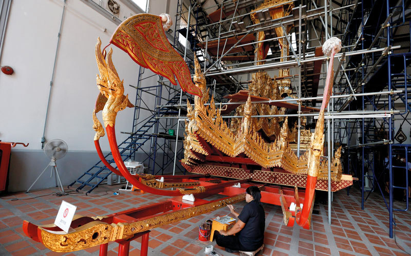 يعكف عمّال، في بانكوك، على تزيين كل بوصة في عربة ستنقل ملك تايلاند في رحلته الأخيرة، في مهمة عمل قد تستغرق أشهراً. والعربة مصنعة من الخشب وتزين بالذهب والمرايا، وتزن 13.7 طناً، ويبلغ طولها 18 متراً، وارتفاعها 11.2 متراً، وعرضها 4.8 أمتار، ويعتقد أن العربة التي تعرف باسم «النصر العظيم»، ستأخذ الملك إلى الجنة.